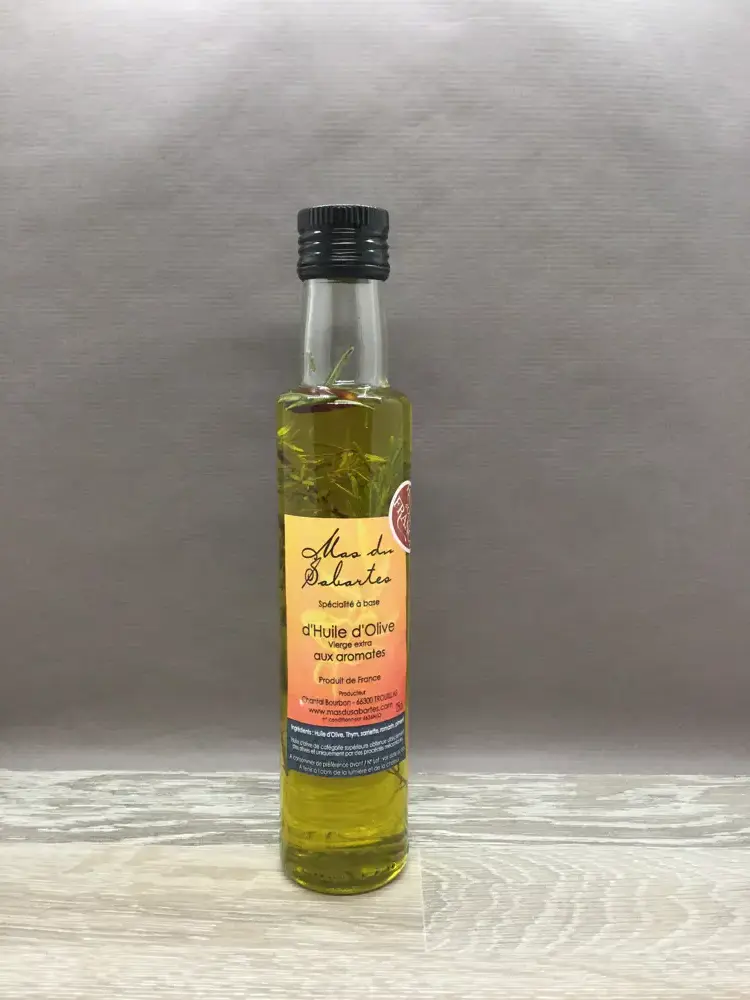Huile d'olive du Mas du Sabartes et aromates du jardin (romarin, thym, sarriette, et petits piments), pour relever tous vos plats, salades et pizzas.