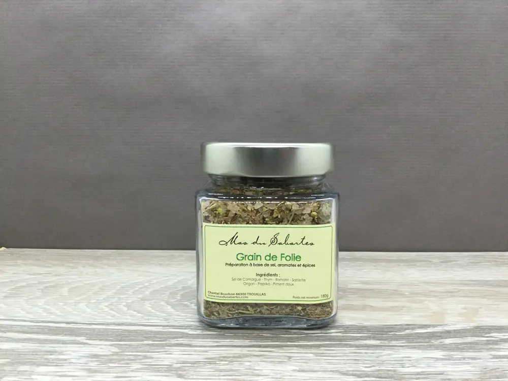 Préparation à base de fleur de sel de Camargue, aromates du jardin (thym, romarin, sarriette et origan) et épices (piment doux et paprika).